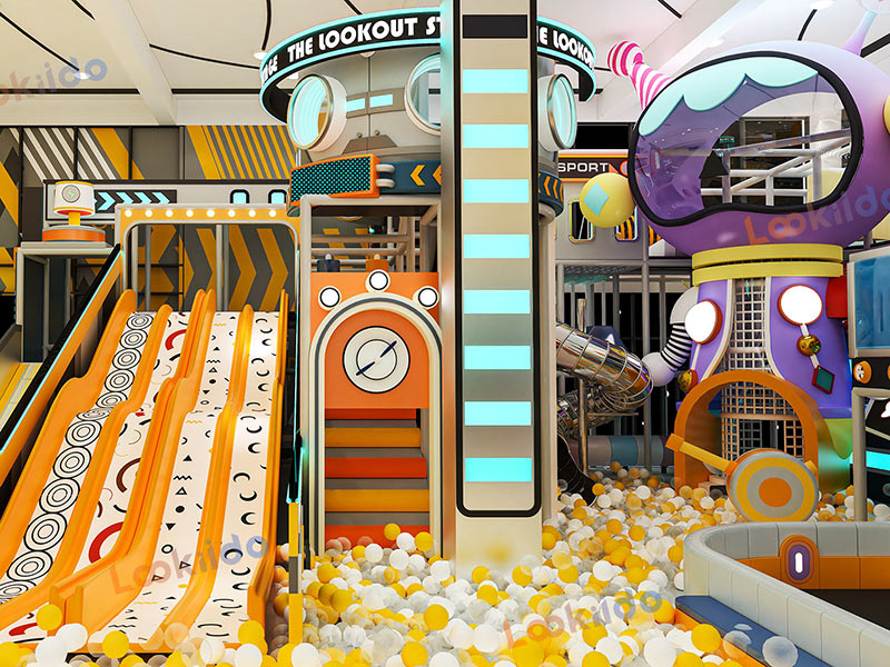Featuring a bold robotic-mechanical theme with metallic accents and cosmic exploration elements, this space offers interactive attractions like a Lunar Sand Zone, Spaceship Maze, Robo-Climb Rope Net, Mega Ball Pit, Cannon Arena, and Soft-Spin Carousel. Perfect for children ages 3-8, it combines active play with sci-fi inspiration in a safe, engaging environment.