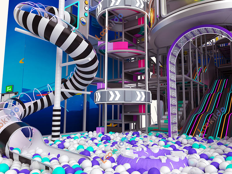 The offering includes soft-play obstacles, rope bridges, an interactive projection ball game, a kids' climbing wall, unique trumpet and tube spiral slides, and various interactive wall games.