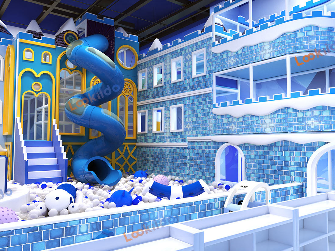 The environment features snow-white safety flooring and detailed, icy-finish castle facades. The internal play structure is built around a robust steel-frame, multi-level maze, integrated with attractions including nets bridges, tube climbs, play vehicles, a ball pool, spiral tube slides, soft swings, a controlled drop tower, interactive tap games, and a ball-blowing machine.
