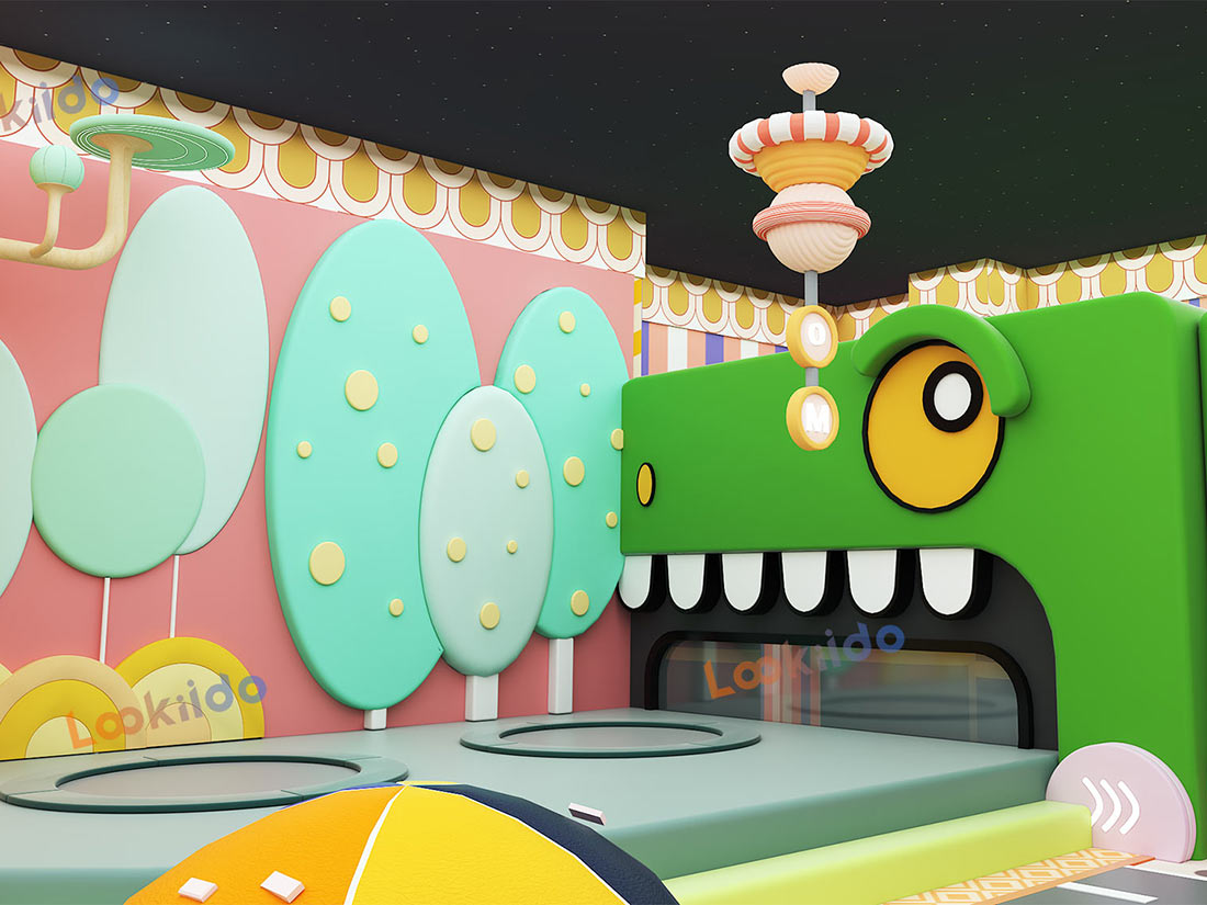 Key attractions include active play zones like trampolines, climbing structures, and various slides. Imaginative play is fostered through role-playing areas like a kitchen, supermarket, and camping tents. Interactive features such as a ball cannon, ball pool, and sensory sand pit further enrich the experience.